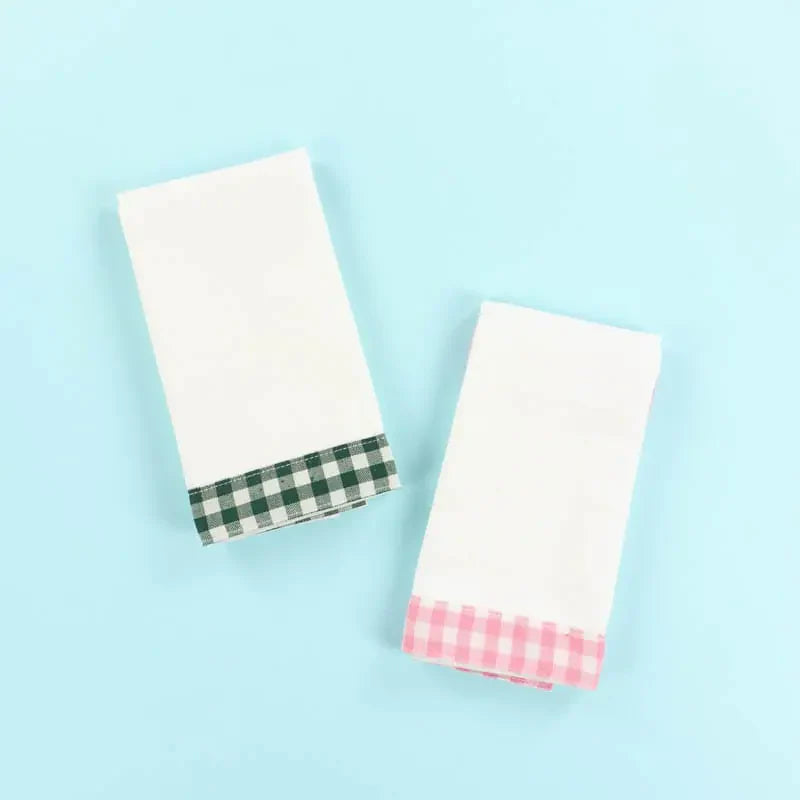 Brighten your kitchen with this charming two-pack of Kimberbell tea towels! One features a pink gingham trim while the other sports dark green—perfect for adding a pop of color to your space. Made from preshrunk cotton, they're ready for embroidery, appliqué, or simply everyday use. A delightful gift for any quilter or home decorator!
